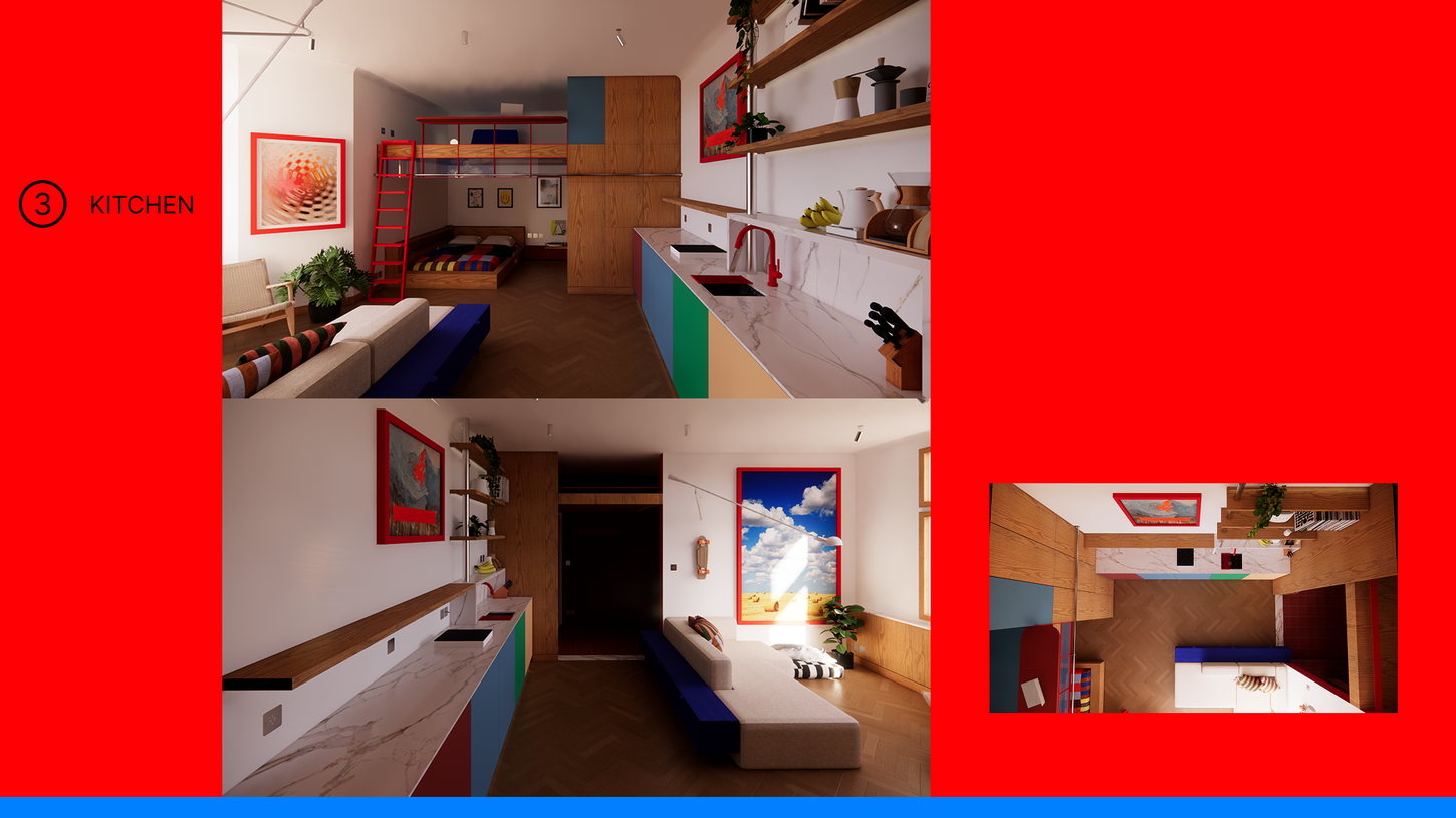 Design Conceptualization of small space living in the Friedrichshain neighborhood of Berlin. Redesign takes into account the building's old bones with a modern, colorful overlay. Gracious ceiling height allows for vertical segmentation of space for multiple uses in a single, limited space.